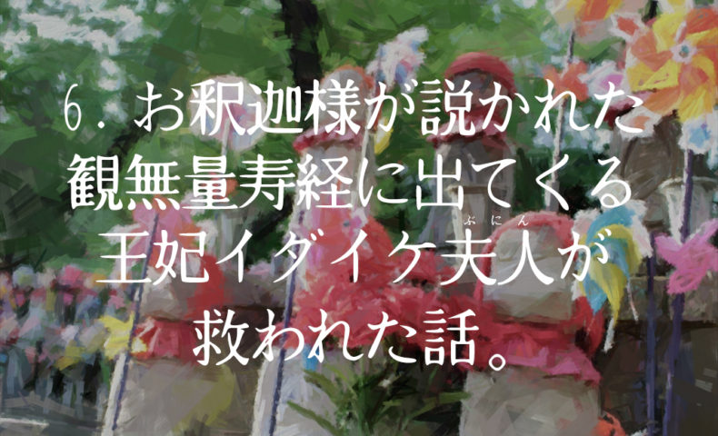 6. お釈迦様が説かれた観無量寿経に出てくる王妃イダイケ夫人(ぶにん)が救われた話。