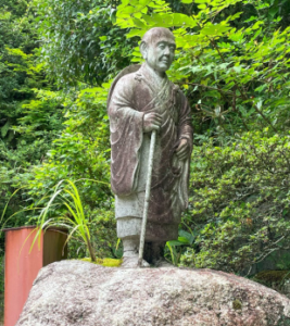 外にあった親鸞聖人の像の前で写真も撮っていただいたり、数珠や教本等を分けていただき、親切にしていただきました。