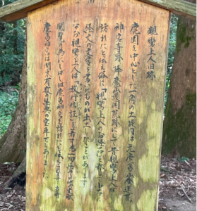 その看板には、鹿島神宮は関東有数の経典の宝庫とされていた。たびたび訪れ釈迦の一切経をはじめとした文献を閲覧していた。そして、聖人の主著とされる教行信証等の参考にされたと記されていた。